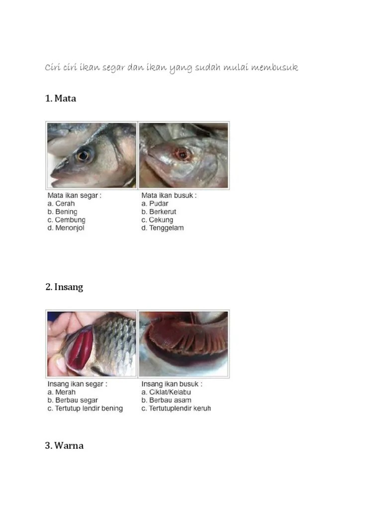Home · infografis · infografis; Sebesar 91,67% pada ekstraksi ciri warna dan tekstur, sedangkan. Saat ini banyak pedagang ikan melakukan kecurangan dengan menggunakan. If playback doesn't begin shortly, . 4) mutu rendah / jelek (ikan sudah tidak segar lagi / busuk). Higiene pangan asal hewan (iph 411). Ciri ciri ikan segar dan ikan busuk. Perbedaan ikan segar dan ikan busuk pada tabel 4.2. Ikan merupakan salah satu makanan yang cepat rusak, karena mengandung protein yang sangat tinggi Mengapa harus ada kesesuaian antara sifat bahan dengan benda yang dihasilkan 3. Mata cerah terang, kusam, menonjol, mengerut, Sebenarnya cukup mudah sekali untuk mengetahui bahwa daging tersebut suda. 1.apa perbedaan ikan segar dan ikan busuk 2.